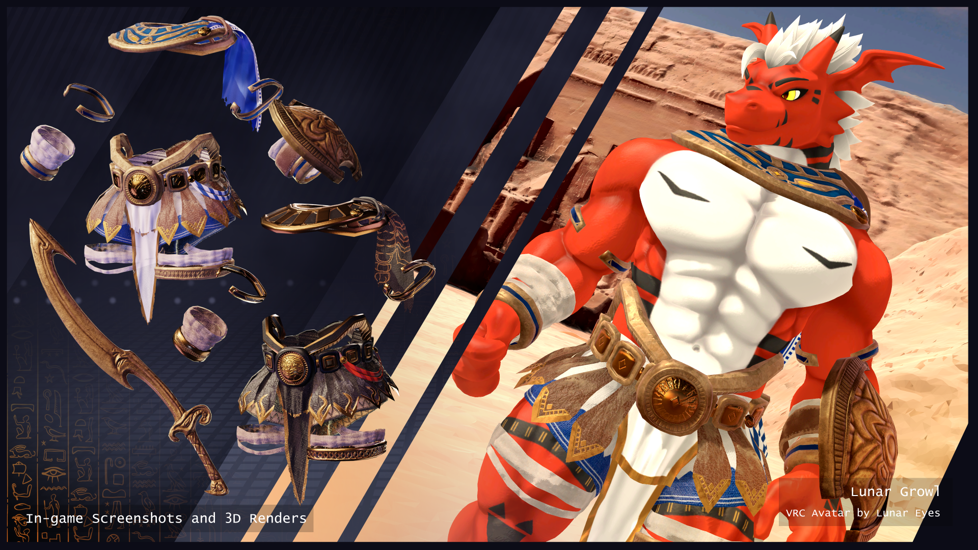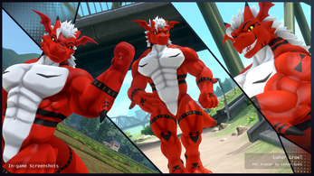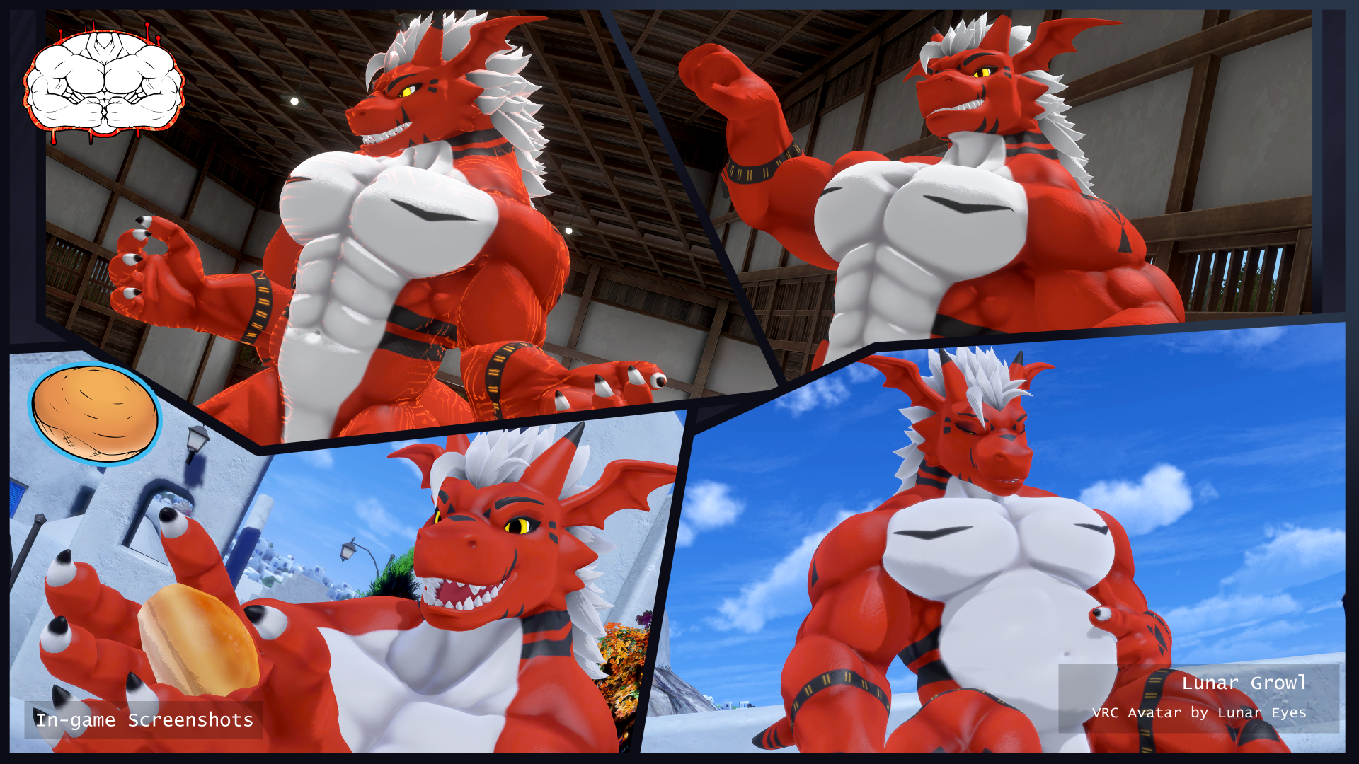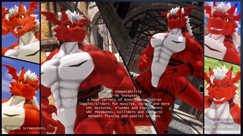 A big demon dragon with a swole heart! He's bound to steal yours away with a bashful smile and a cheeky flex of his strong arms. Growl finally arrives to VRChat ready to make a towering impression!
